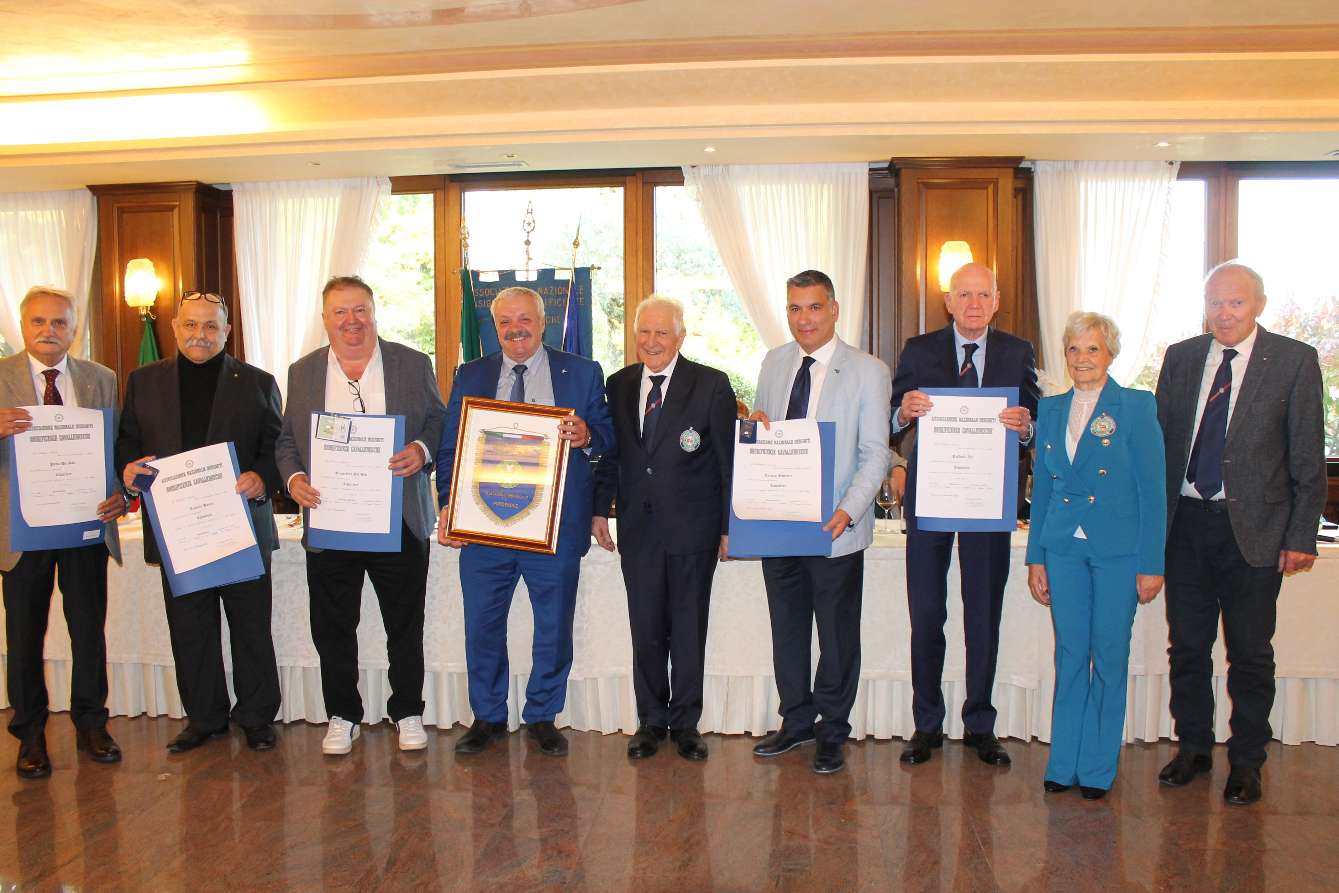 I Nuovi Insigniti iscritti all'A.N.I.O.C. da SX - Cav. Paolo Da Dalt, Cav. Antonio Bauco, Cav. Gioacchino Del Ben, Sindaco Michele Bier, Comm. Silvio Romanin, Cav. Renato Favretto, Cav. Raffaele Zol, Uff. Paola Zelanda. e il Cav. Franco Modotti. |